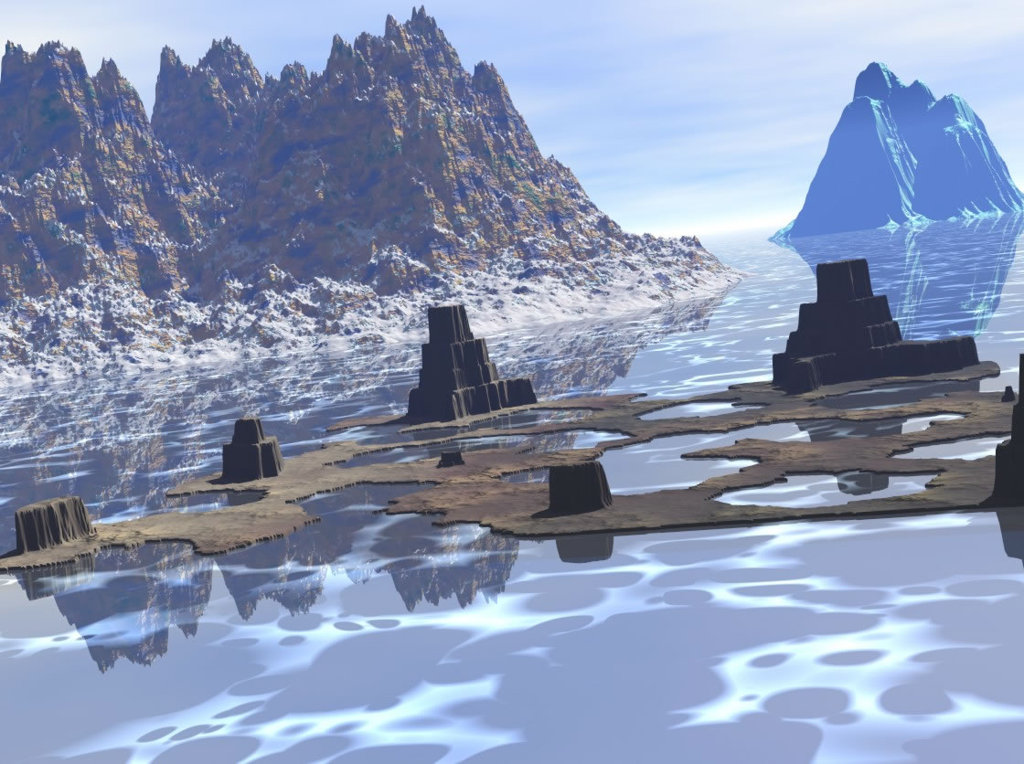 A dream: flying through the strange place... the iceberg in the background, holy looking mysterious formations on precarious grounds in the middle of dirty waters... mountains on the left. [Dec 2005]